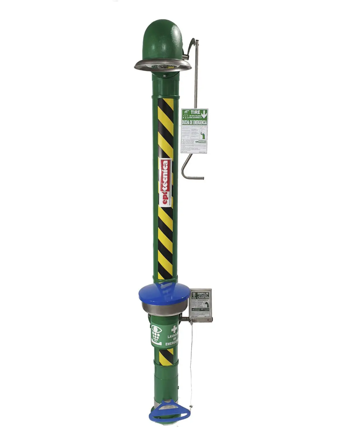 Ducha y lavaojos de emergencia fabricados en acero inoxidable AISI 304L, ideales para entornos industriales.