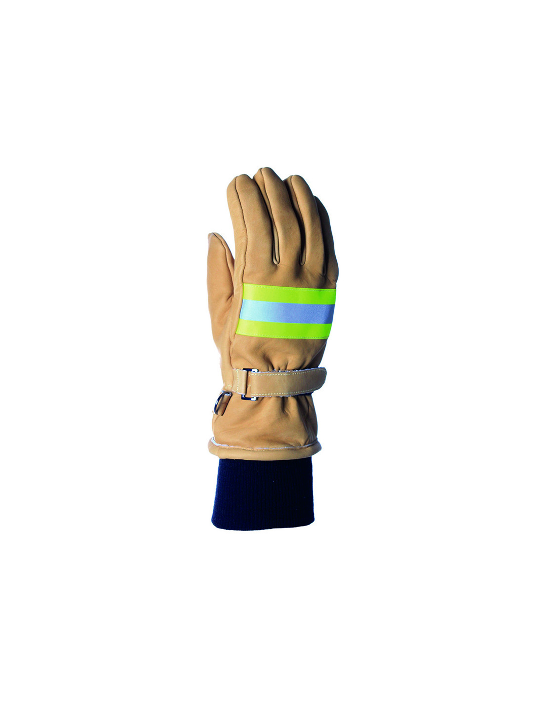 En la parte superior del dorso lleva, cubriendo los nudillos, una banda reflectante fluorescente en combinación amarillo/gris/amarillo.