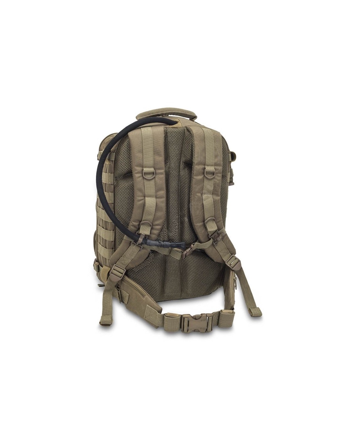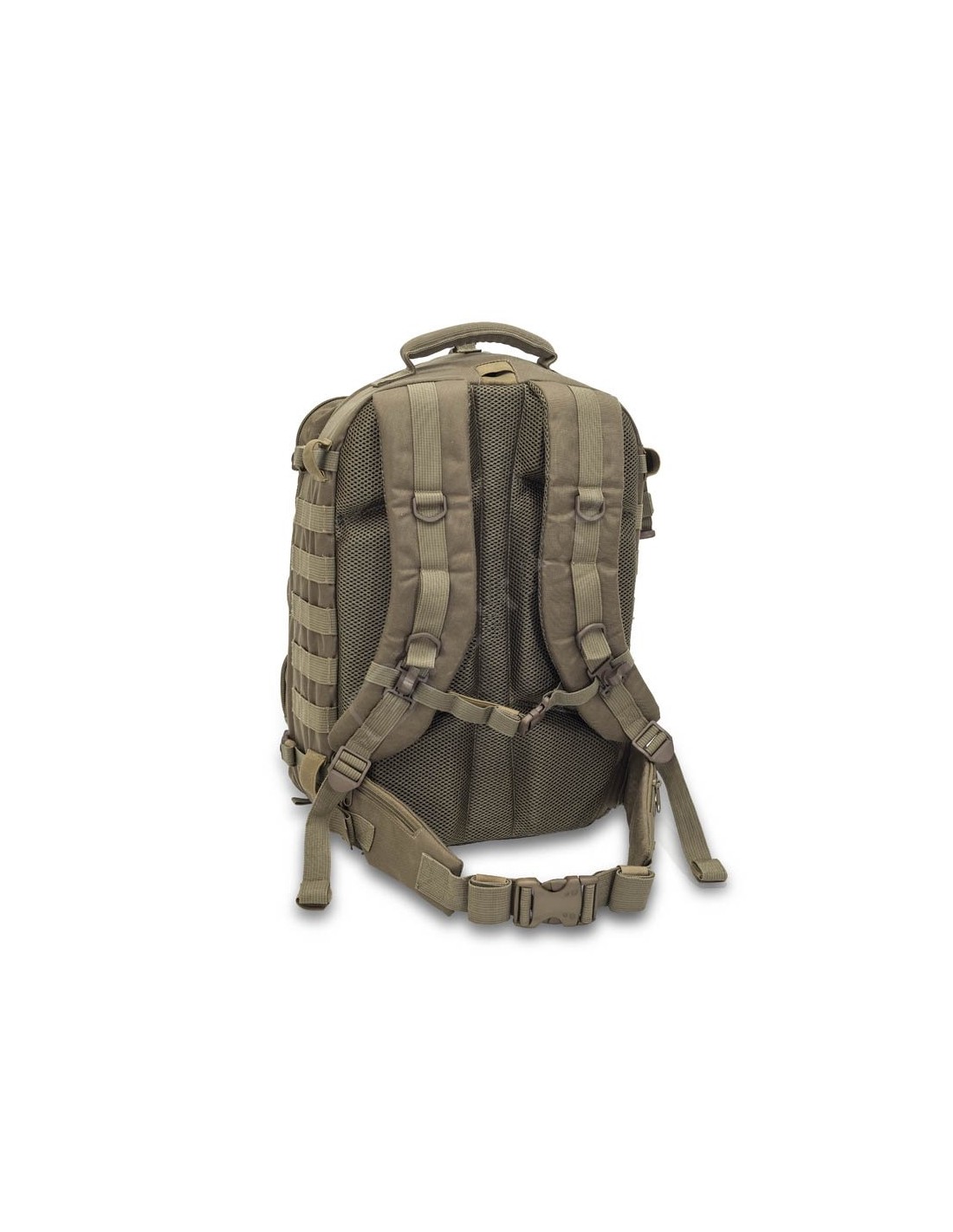 Sistema MOLLE en toda la parte externa de la bolsa, tanto frontal como laterales, para poder anclar bolsillos extras o material diverso