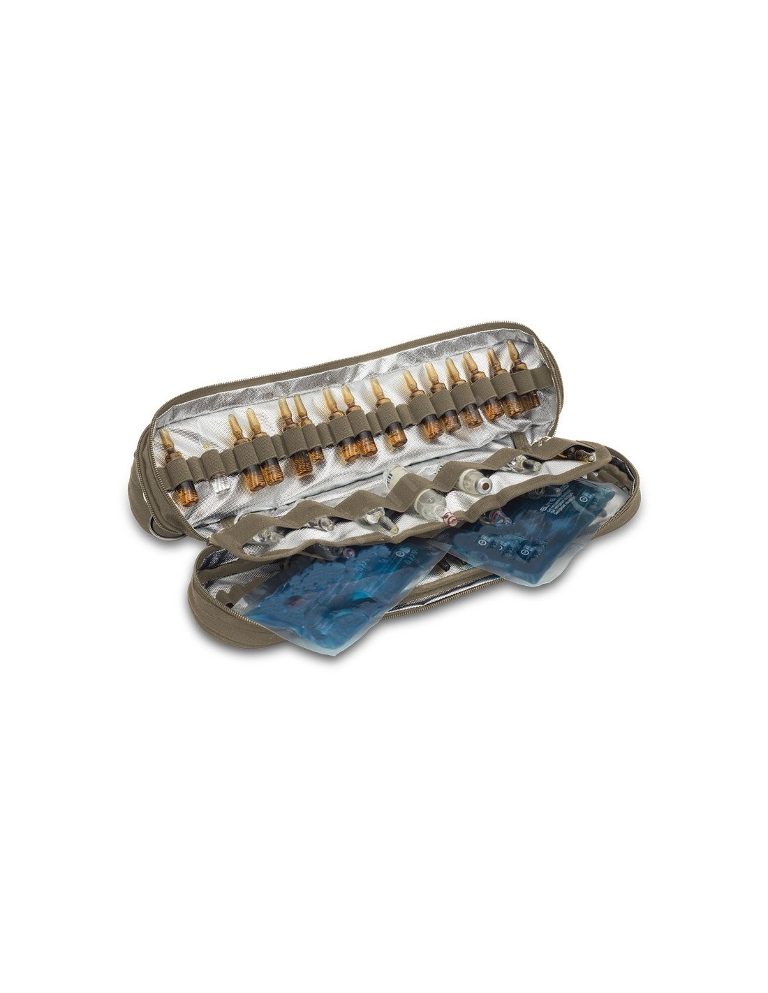 Cintas interiores con cierre de velcro para sujetar la botella de oxígeno o el respirador manual.