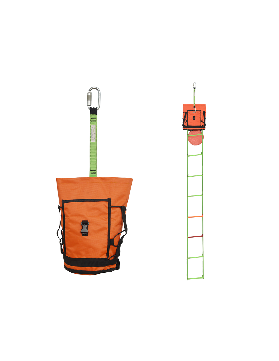 - Escalones con refuerzo rígido de aluminio, diám. 11 mm- Fijada a una estructura / un punto de anclaje mediante un conector unido a la hebilla textil alta, y desenrollada hasta el nivel de la víctima, permite que esta última llegue a un lugar seguro (por ascenso o descenso).