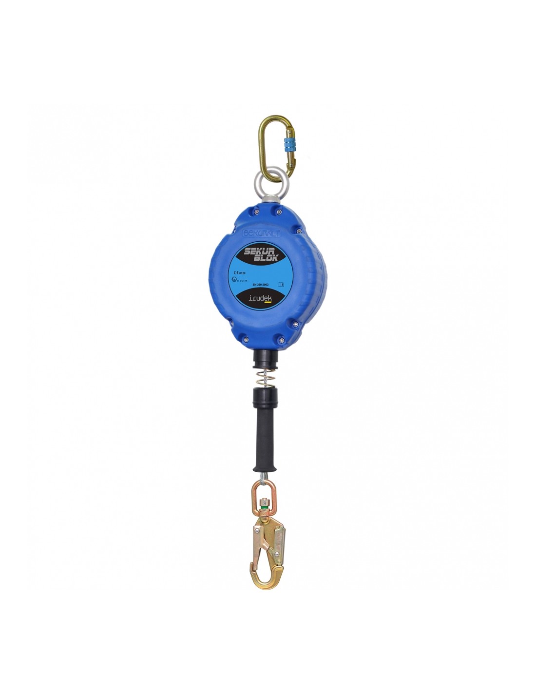 Anticaídas de reposición automática con cárter sintético robusto y duradero Cable galvanizado Ø4.5mm Anilla de acero en la parte superior + mosquetón ref. 981 Mosquetón giratorio con indicador de caída ref. 986 en la parte inferior.