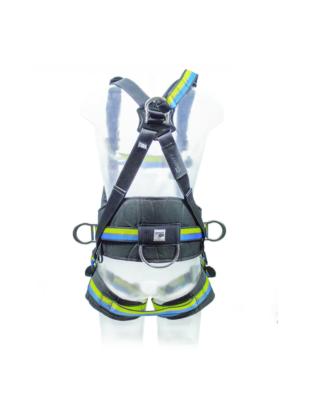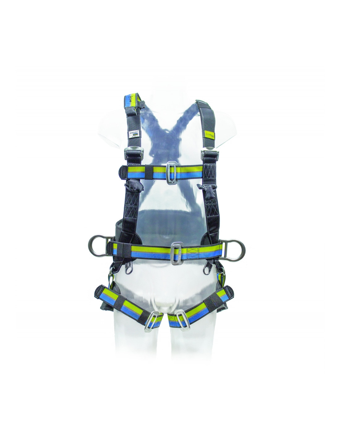 Arnés con 1 punto de anclaje dorsal y cinta de extensión + 1 punto de anclaje esternal + cinturón de posicionamiento giratorio 180º con 2 anillas “D” laterales y anillas porta-herramientas.